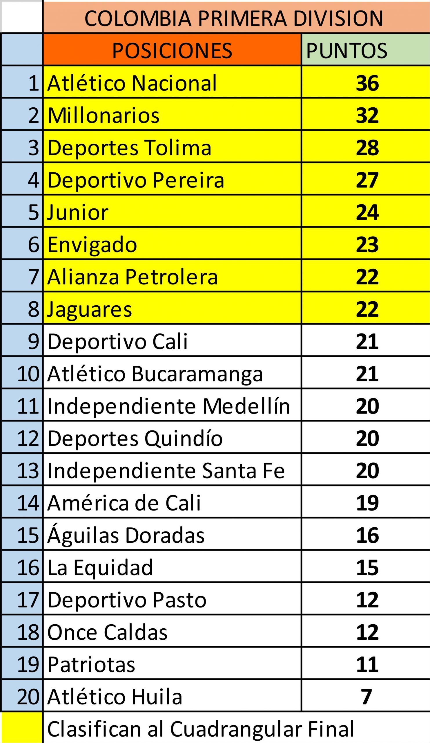 Atlético Huila descendió a la Primera B de Colombia, en esta fecha cayó derrotado ante Independiente Santa Fe por 2 a 1. Deportes Quindío está en la cuerda floja a pesar de ganar por 1 a 0 a Alianza Petrolera y cuando faltan 15 puntos en juego está a siete