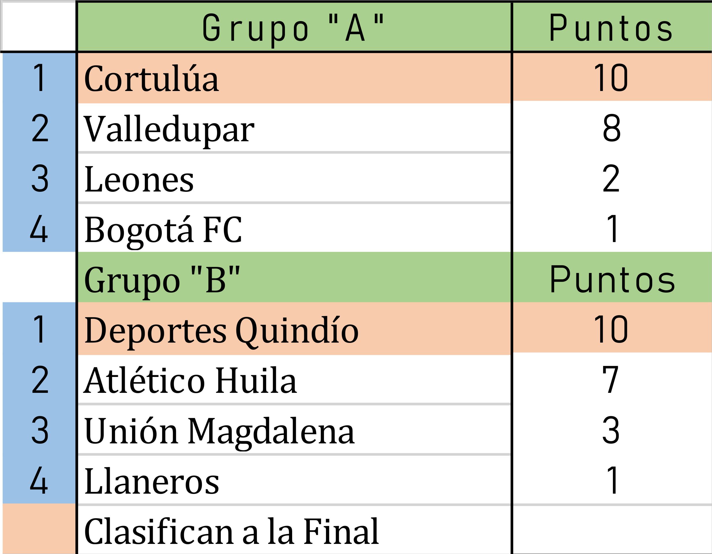 En el Grupo “A” Cortulúa es líder, seguido por Valledupar desde muy cerca, mientras que Leones y Bogotá ya quedaron eliminados. En el Grupo “B” manda Deportes Quindío con 10 unidades, mientras su único escolta y rival para pelear hasta el final por la clasificación Atlético Huila está a tres puntos con 7, en tanto los demás integrantes del grupo Unión Magdalena y Llaneros ya quedaron eliminados.