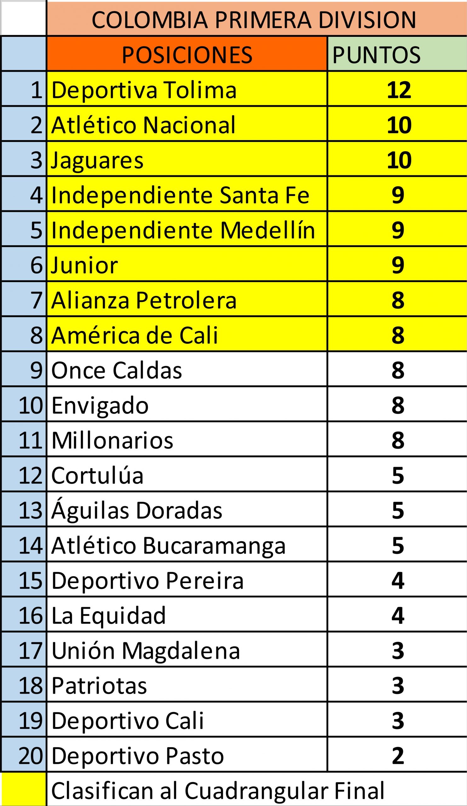Atlético Nacional, superó a Deportivo Pasto por 1 a 0, y Jaguares, que perdió con Alianza Petrolera por 2 a 0. Independiente Santa Fe del técnico argentino Martín “Chapulín” Cardetti quedó en la tercera posición después de 2 a 2 con América de Cali.