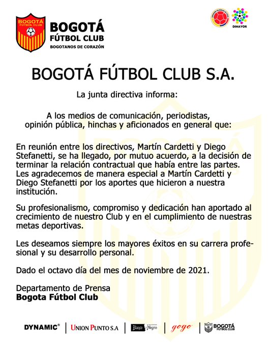 Del club emitieron un comunicado: “Informamos que Martín Cardetti y Diego Stefanetti, por mutuo acuerdo, terminan su contrato con nuestro Club. Estamos muy agradecidos por el proceso que llevaron con Bogotá Fútbol Club y les deseamos el mayor de los éxitos”.