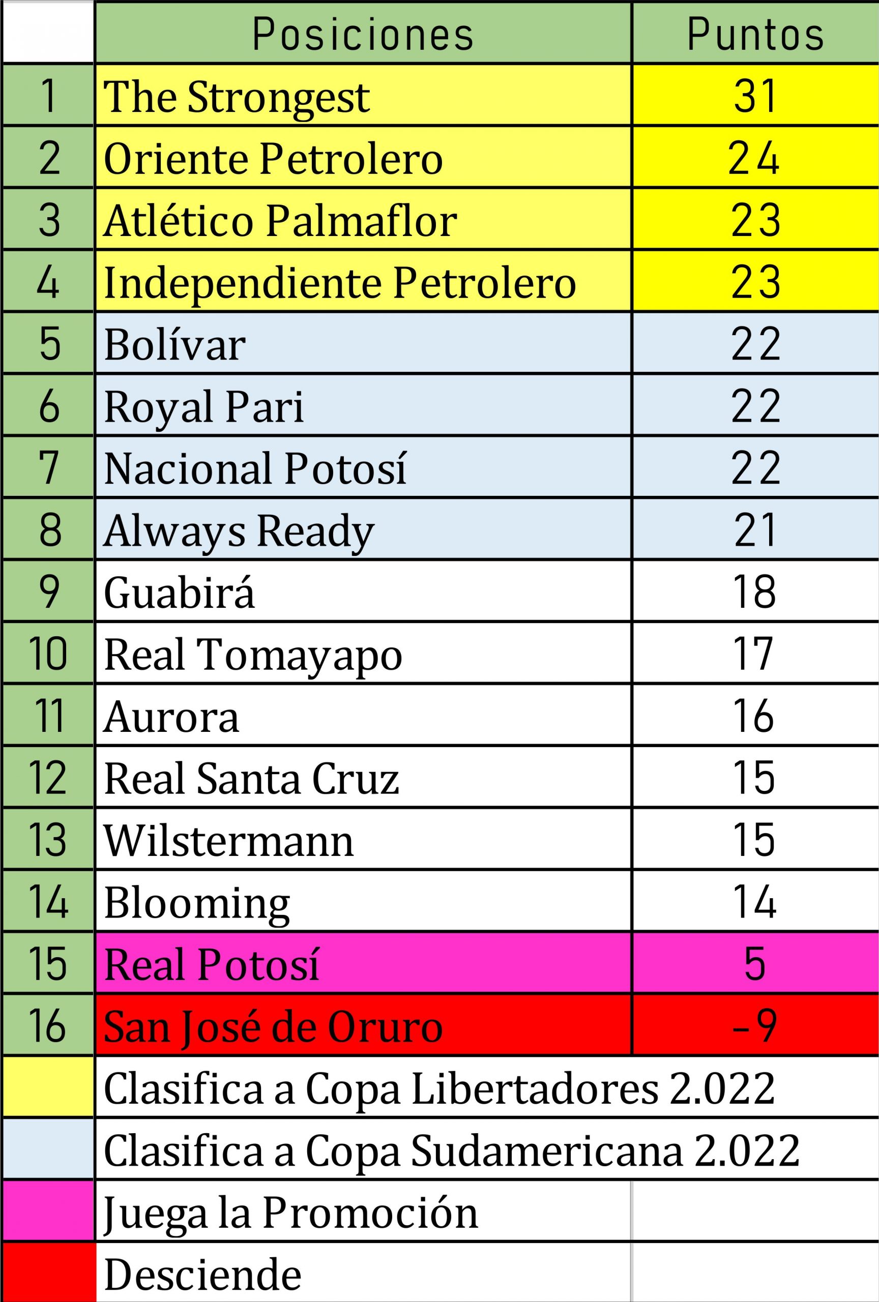 The Strongest es el puntero con 31 unidades, siete más que el segundo Oriente Petrolero y